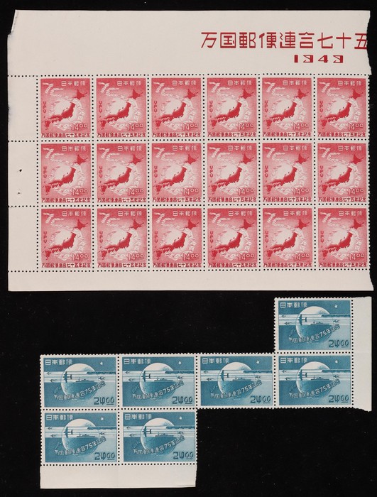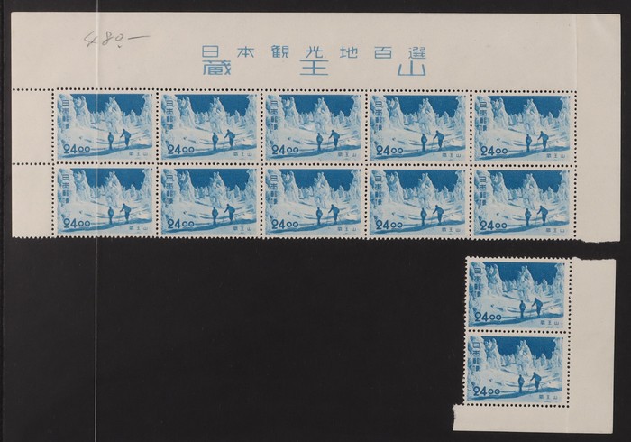 24Y light blue blk of 10 with margins & inscription, plus 1951 Tourist Issue 8Y olive-green, blk of 12 with margins, plus inscription. VF fresh MNH. Sak C199, C200 cat 87,000Y+. SG 607, 608 cat £456+. (3 items). (Image1) (Image2)