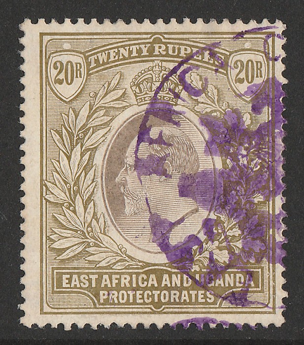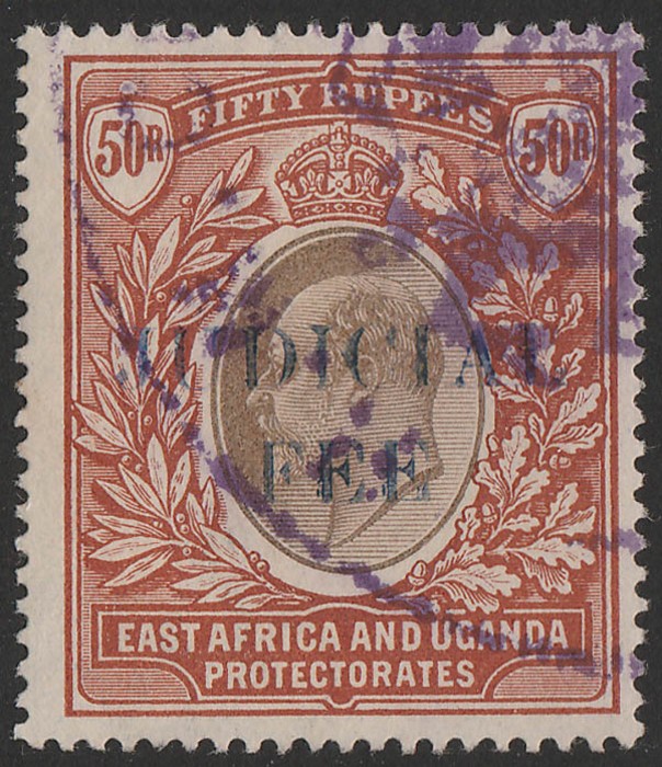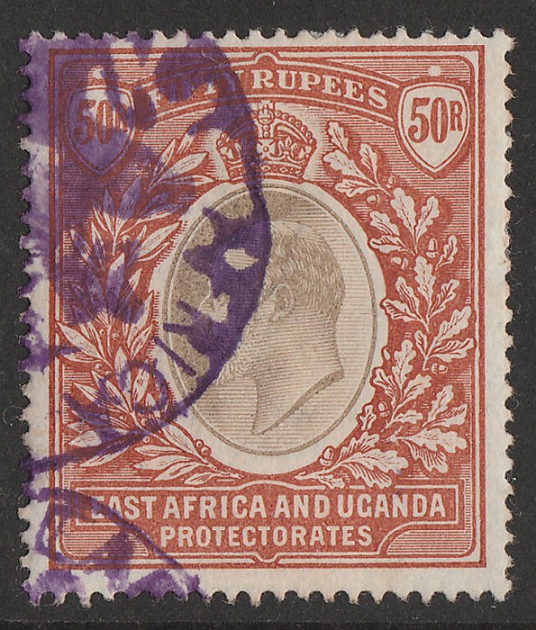 seriffed opt KEVII 50R black & red-brown, wmk crown CC. Superb F/C arms violet cancel. Bft 38 cat £350+. Extremely rare top value. (P) (Image1)