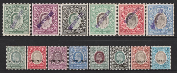 ½a-10R, wmk mult crown with ½a-8a SPECIMEN seriffed local opts (15x2mm) & 1R-10R diag SPECIMEN violet h/s local opt type K3 (22x2.5mm) which was used for presentation sets. Superb fresh MNH. SG 17s-31s(var) cat £850 for normals M,