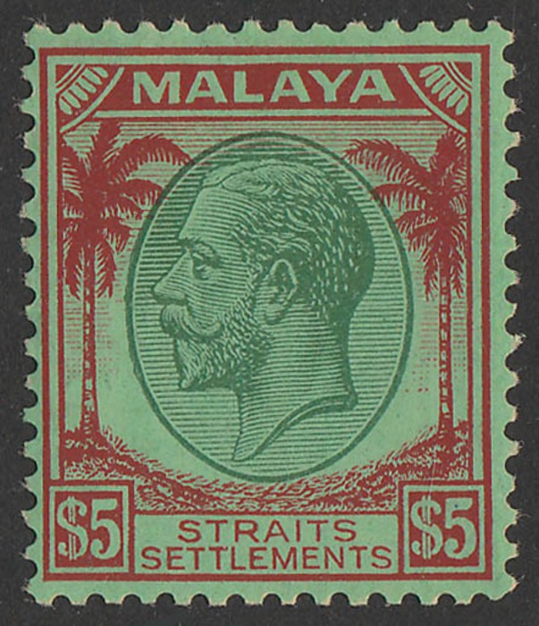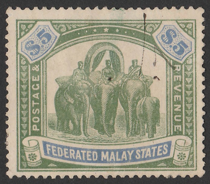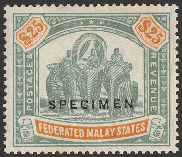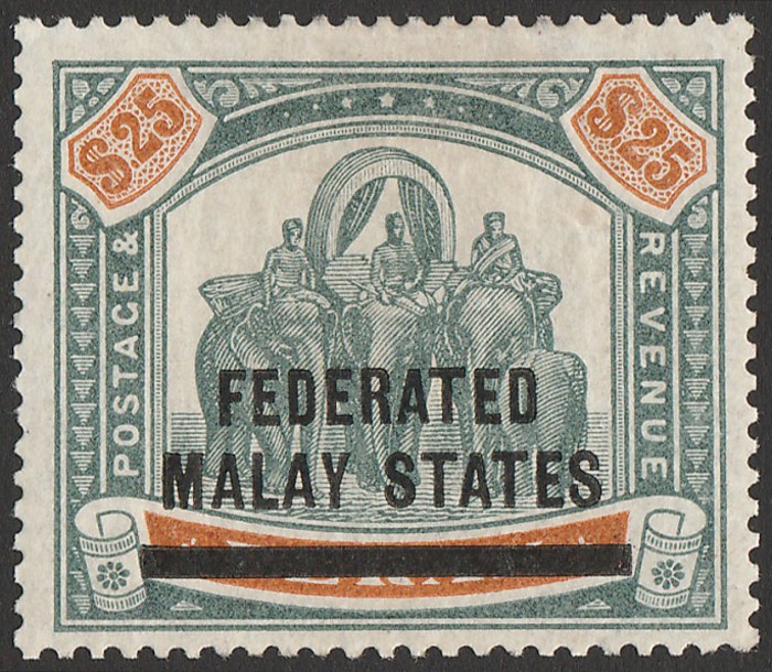 Elephants $25 green & orange top value. Superb fresh M, nice original gum & beautiful colours. Scott 13A cat US$15,500, SG 14 cat £17,000+. The key stamp of all of all the Malayan States Elephant issues. Major rarity genuine mint in such nice