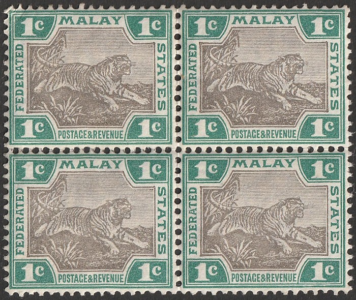 1c grey-brown & green, blk of 4, wmk Crown CA. VF fresh MNH. Scott 18b cat US$56 for M singles. SG 15b cat £60 for M singles, should be at least double £120 MNH plus premium for blk. (Image1)