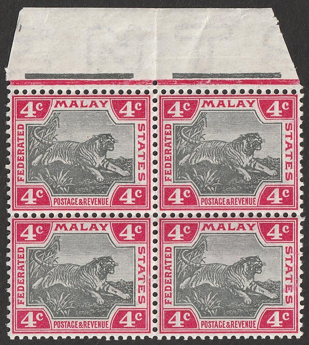 4c grey & carmine, top marginal blk of 4, wmk Crown CA. VF fresh MNH. Scott 20a cat US$50 for M singles. SG 17a cat £60 for M singles, should be at least double £120 MNH plus premium for blk. (Image1)