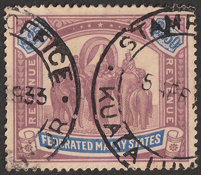 Elephant $25 (2) & Elephant Revenue $250 tied on piece by m/s lines & Stamp Office Kuala Kangsar 14 Aug 1926 oval h/s. F-VF, mnr blemishes as to be expected. Bft 2 & 8 cat £200+. (P) (Image1) (Image2)