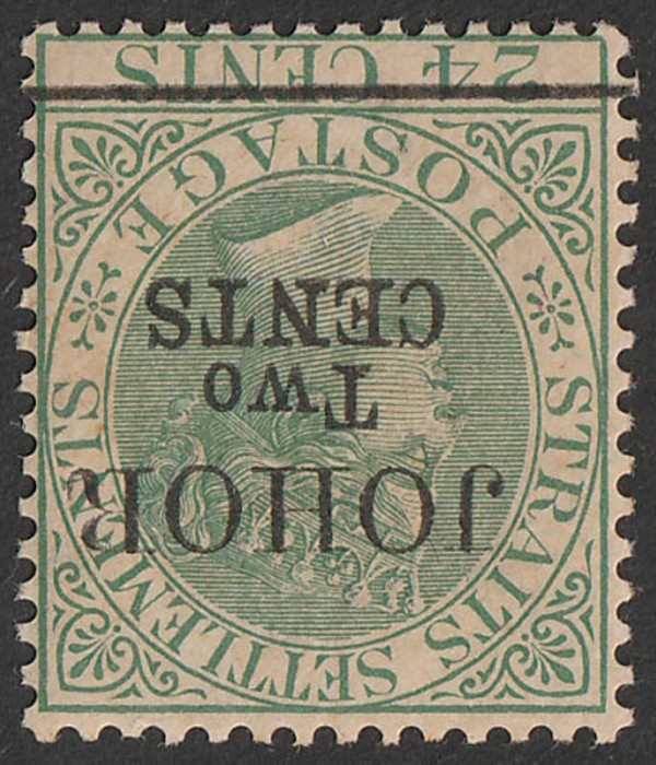 'JOHORE TWO CENTS' opt QV 24c green, opt SG type 19, error wmk INVERTED. VF MNH darker gum. Sc 16(var). SG 19w cat £450 for M, should be at least double, £900 MNH. (P)