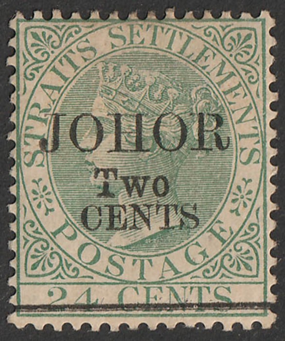 'JOHORE TWO CENTS' opt QV 24c green, opt SG type 20. VFM. Sc 17. SG 20 cat £160. (P) (Image1)