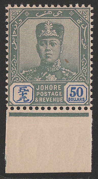 Sultan $50 green & ultramarine, wmk Rosette. Superb MNH, with darker never hinged original gum, bottom marginal. Scott 74 cat US$425. SG 76 cat £475 for M, should be at least double, £950 MNH. (P) (Image1)