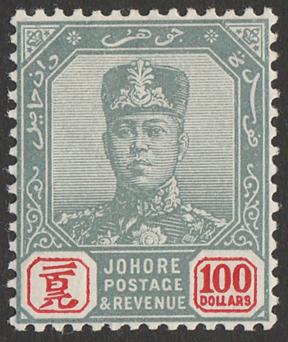 Sultan $100 green & scarlet, wmk Rosette. Superb fresh MNH, pristine never hinged original gum. Scott 75 cat US$625 for M, SG 77 cat £650 for M, should be at least double, £1300 MNH. Rare in such fresh MNH quality & certificate can be