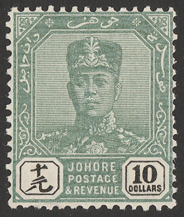 Sultan $10 green & ultramarine wmk Rosette. VF fresh MNH, diag gum bends. Scott 74. SG 76 cat £500 for M, should be at least double, £1000 MNH. (P) (Image1)