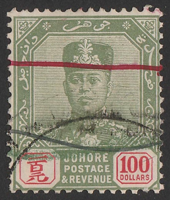 Sultan $100 green & scarlet, wmk script. VF F/C with m/s lines. Scott 124 cat US$160 for F/C, SG 127 cat £150 as F/C (normal M cat £2000). (P) (Image1)