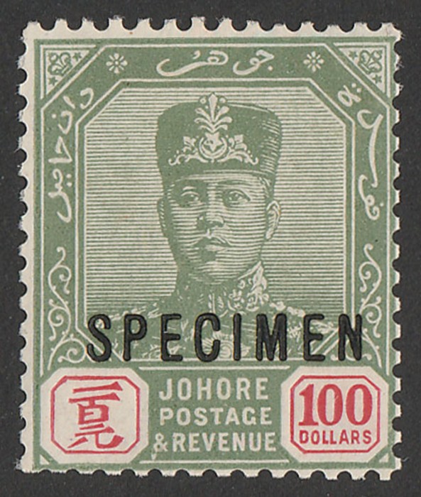 Sultan $100 green & scarlet, wmk script, opt SPECIMEN. F-VF fresh MNH. SG 127s cat £450 for M, should be at least double, £900 MNH (normal cat £2000 M so £4000 MNH). (P) (Image1)