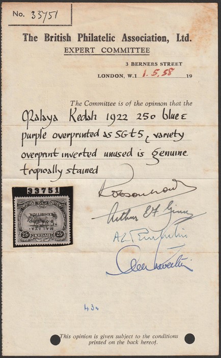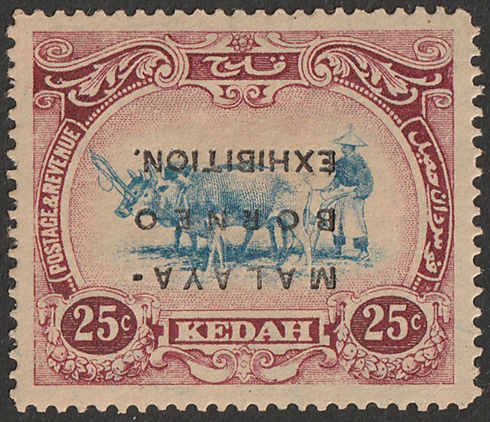 Malaya-Borneo Exhib opt Ploughing 25c blue & purple, error opt INVERTED. VF M, tropicalised gum as usual. Scott 13ab cat US$1625. SG 43a cat £1600. Rare genuine as only 1 pane of 60 printed. BPA photo-cert. (P) (Image1) (Image2)