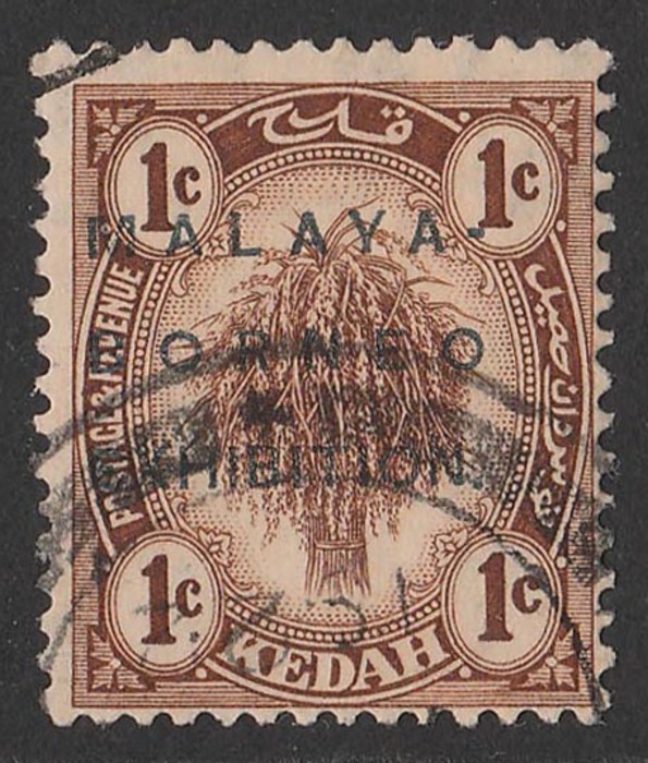Malaya-Borneo opt Rice Sheaf 1c brown. VFU with proper 1922 cds. Scott 23a cat US$30, SG 45 cat £35++. (Image1)