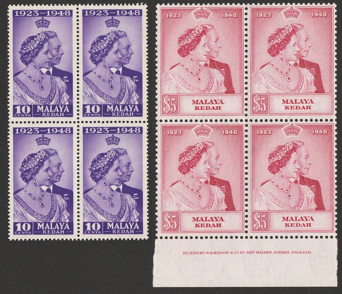 Silver Wedding set 10c & $5 with $5 in Bradbury Wilkinson imprint blk of 4, while 10c normal blk of 4 (as imprints do not exist on 10c). Superb fresh MNH. SG 70-71(var) cat £114 as singles & should be at least double, £228++ for rare
