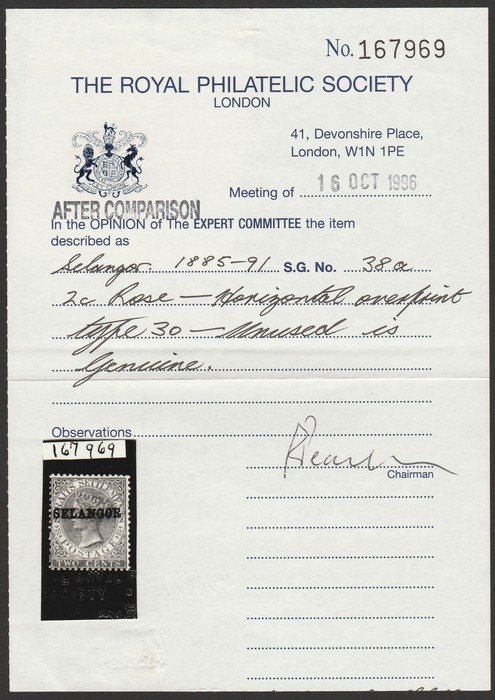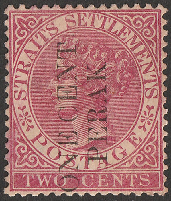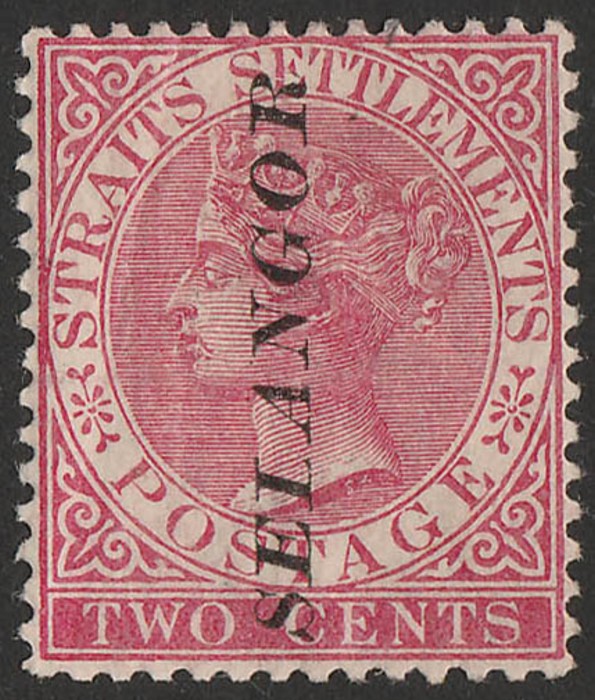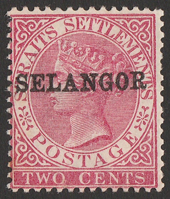 'SELANGOR' horiz opt QV Straits 2c bright rose, opt SG type 30. VF fresh MLH. Sc 18A. SG 38b cat £4750. Extremely rare, only several recorded. 1996 RPSL photo cert, while diff new certificate can be obtained on request. (P) (Image1) (Image2)