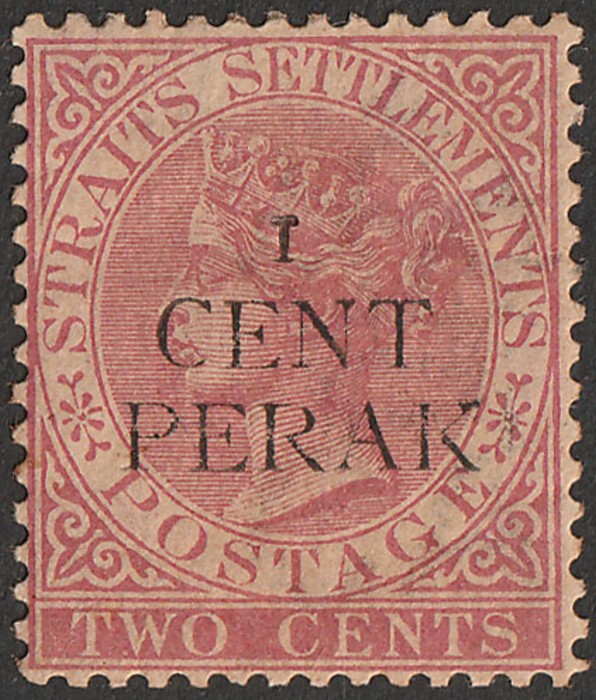 PERAK' opt QV Straits 2c pale rose, opt SG type 28, wmk crown CA. VF M, tropicalised original gum. Scott 18A cat US$1750. SG 31 cat £2000. Very rare genuine mint & certificate can be obtained on request. (P) (Image1)