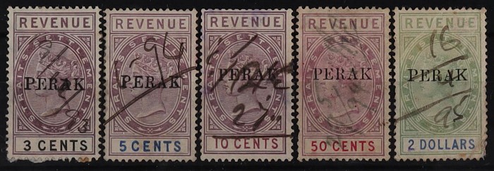 medium 'PERAK' opt QV Revenue 3c-50c & $2, opt 12x2¼mm. Mostly F-VF F/C. Bft ex 9-14. (5) (P) (Image1)