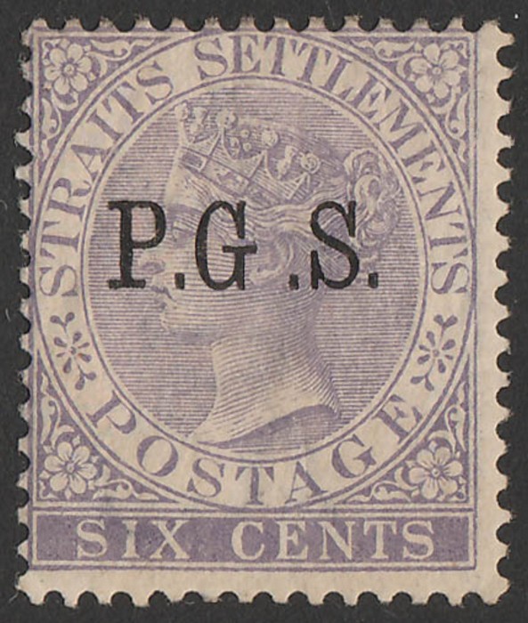 opt QV Straits 6c lilac, variety wide space between 'G' & 'S'. F-VF M. SG O3a cat £350. RPSL photo cert. (P) (Image1) (Image2)