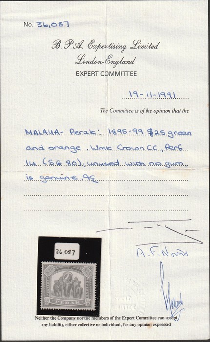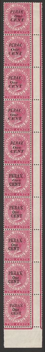 PERAK' black vert opt QV Straits 2c pale rose, opt SG type 27. Superb UN, excellent centring & deep colour. Scott 15A cat US$2150. SG 30a cat £2000. Very rare genuine. Exp Thier & Bloch while certificate can be obtained on request. (P) (Image1)