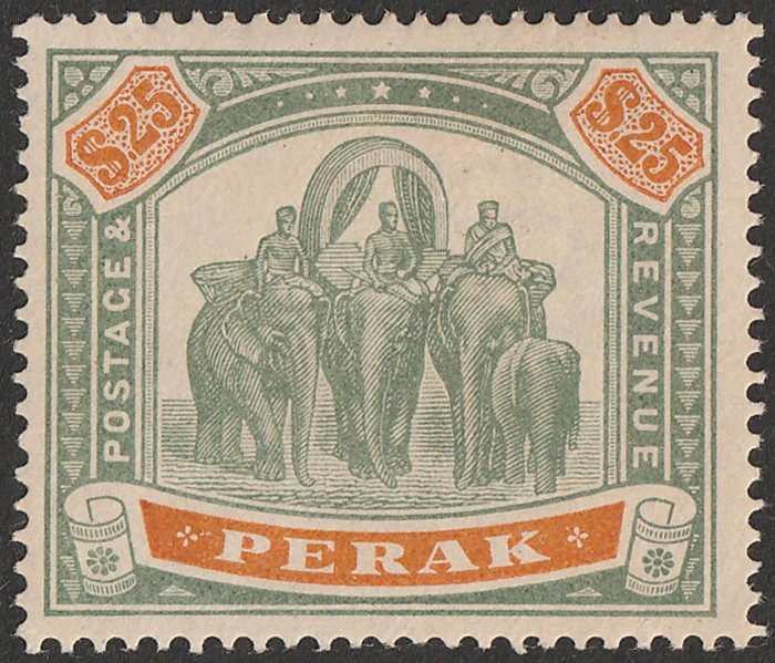 Elephants $25 green & orange. Superb fresh UN, excellent perfs & with unusually nice colours. Scott 61 cat US$11,000. SG 80 cat £12,000. SG 80 cat £12,000. Very rare genuine unused example of this top value. BPA photo-cert. (P) (Image1) (Image2)