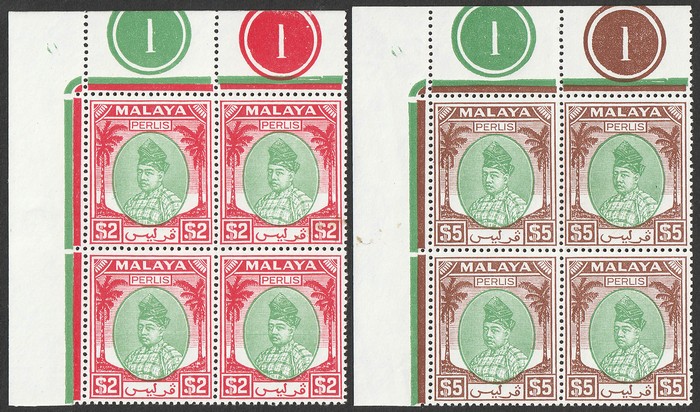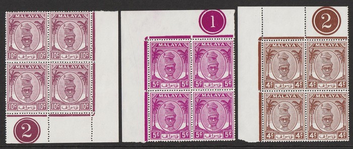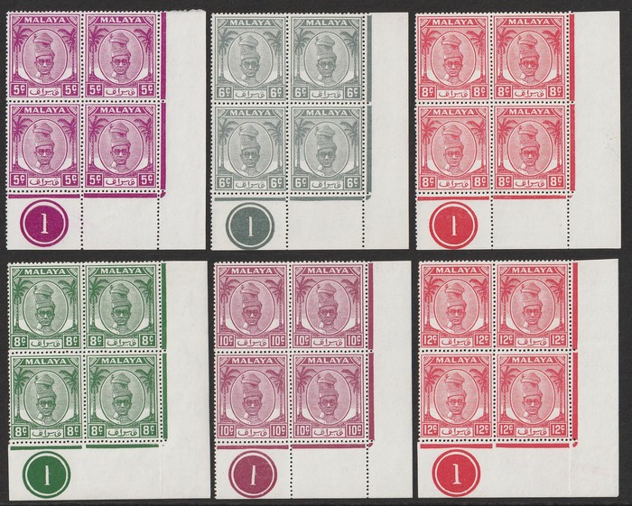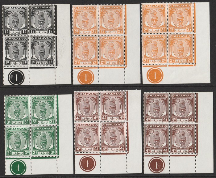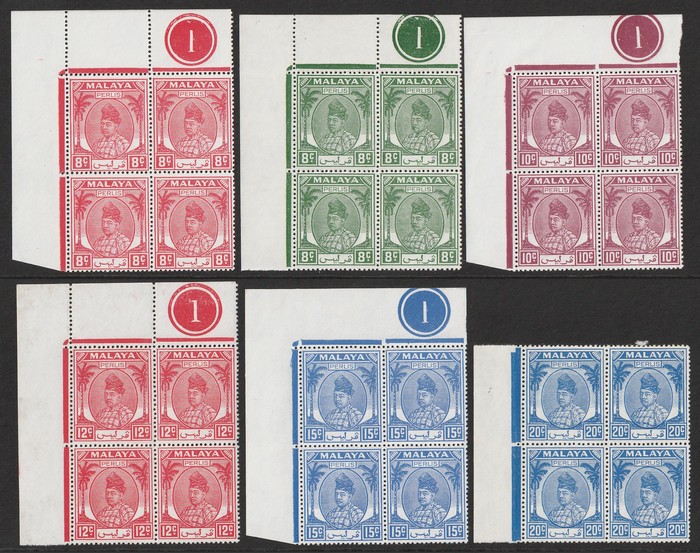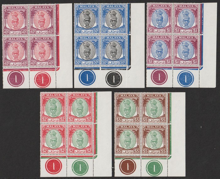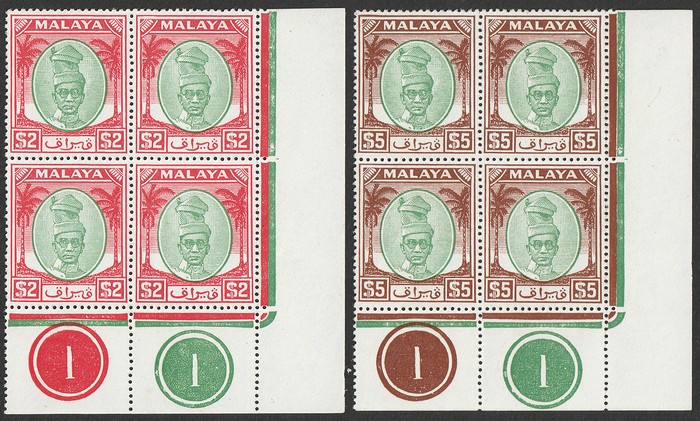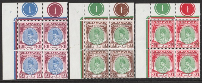 Sultan Palm Trees set 1c-$5, plus 2c, 4c & 5c shades, all cnr marginal blks of 4 with plate no '1'. Also 4c & 10c blks with plate no '2'. VF fresh MNH. SG 128-148, 131a cat £720 for singles, plus premium for plate blks, should be +50%, so est