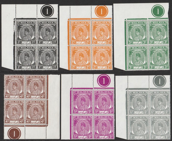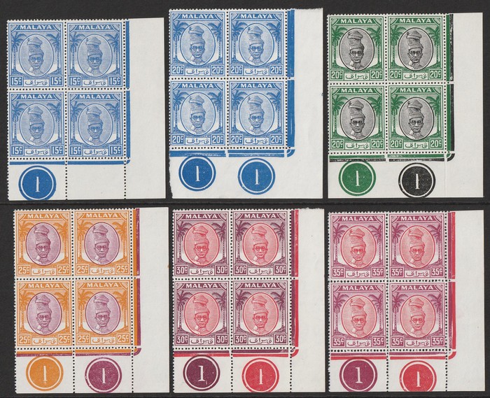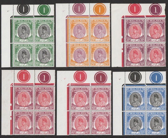 Sultan Palm Trees set 1c-$5, all UL cnr marginal blks of 4 with plate no '1' (except 20c is normal blk). VF fresh MNH. SG 7-27 cat £760 for singles, plus premium for plate blks, should be +50%, so est cat £1140. (21 blks) (P) (Image1) (Image2)