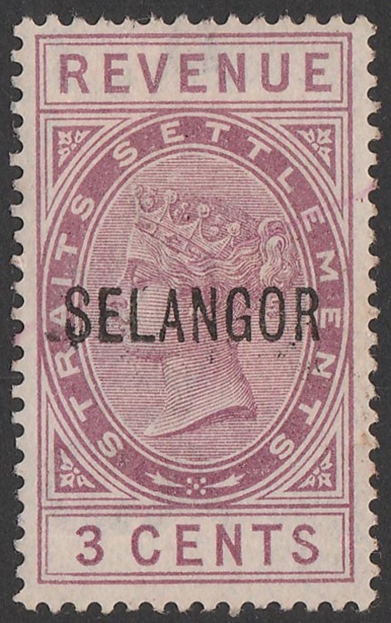 'SELANGOR' opt QV Revenue 3c purple, sans-serif, opt condensed (14½ x 3mm). VF UN. Bft 10. (Image1)