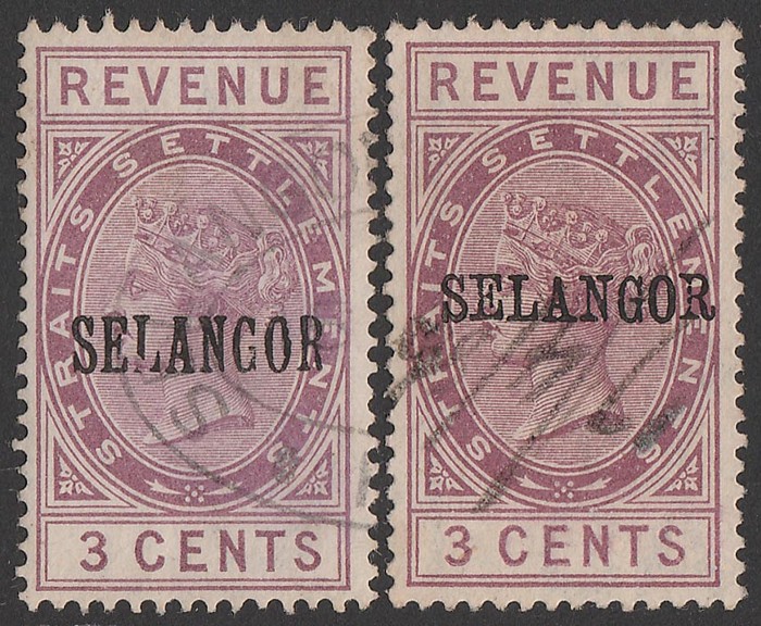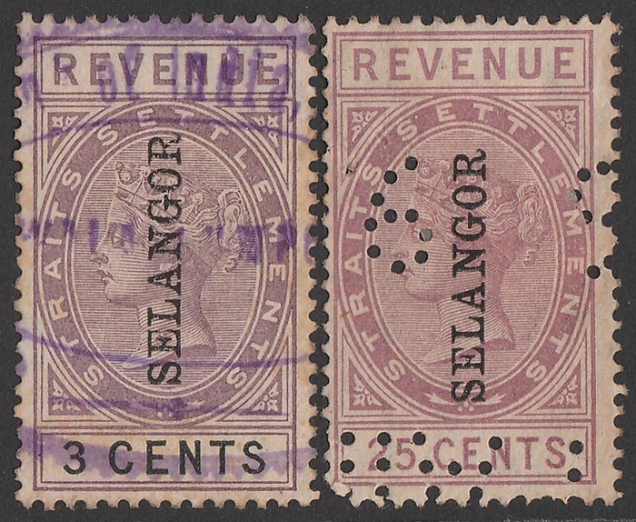 'SELANGOR' vert opt QV Revenue 3c lilac & black & 25c purple, seriffed, opt 17 x 2mm, reading up. F-VF F/C. Bft 52 & 56. (2) (Image1)
