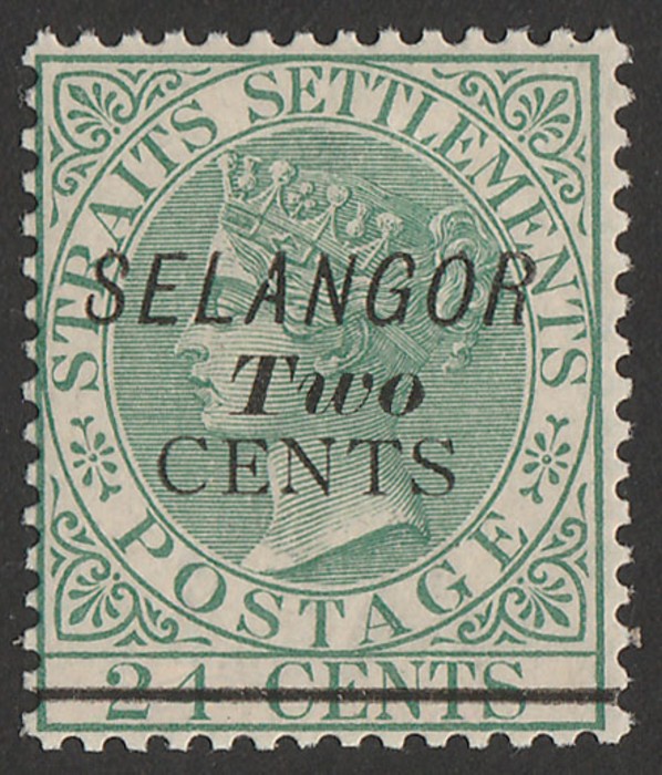 'SELANGOR TWO CENTS' opt QV 24c green, opt SG type 35. VF MNH. SG 44 cat £55 for M, should be at least double, £110 MNH. (Image1)