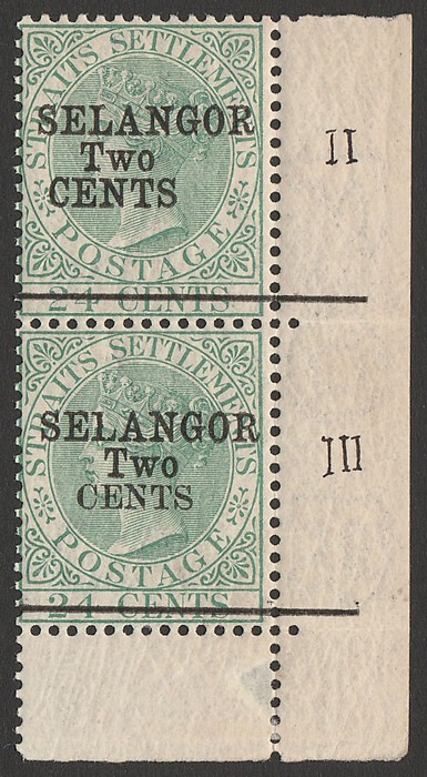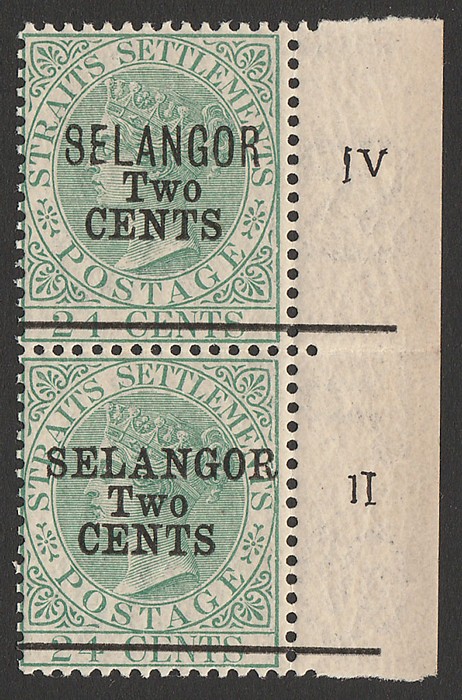 'SELANGOR TWO CENTS' opt QV 24c green, setenant vert pr, top stamp opt SG type 38 & bottom stamp type 39. VF MNH bottom marginal. Scott 22+23 cat US$350++. SG 47+48 cat £450 for M singles, should be at least double, £900 MNH, plus premium