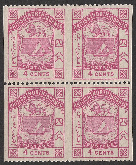 'North Borneo' right marginal blk of 4, pos 29-30, 39-40. Superb 2M/2MNH, w/c. Scott 13 cat US$220 for M. SG 13 cat £260 for M singles, MNH should be at least double £390 plus premium for scarcer multiple. (P) (Image1)
