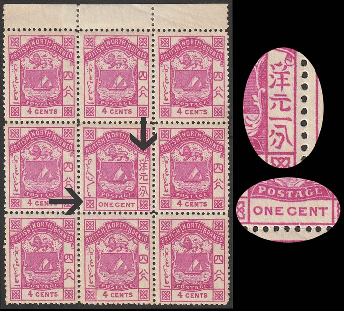 inscribed 'POSTAGE' top marginal blk of 9, centre stamp error 'ONE CENT' instead of '4 CENTS' Stamp superb MNH, nice colour & excellent centring. SG 26/26d cat £410 for M singles, should be at least double, £820 MNH, plus premium for