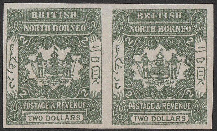 sage-green, inscribed British North Borneo with 'British' measuring 12mm, IMPERF horiz pr. Superb fresh UN, 4 large margins. Scott 34a cat US$600, SG 32a cat £600 & undercataloged. Very rare. (2). (P) (Image1)
