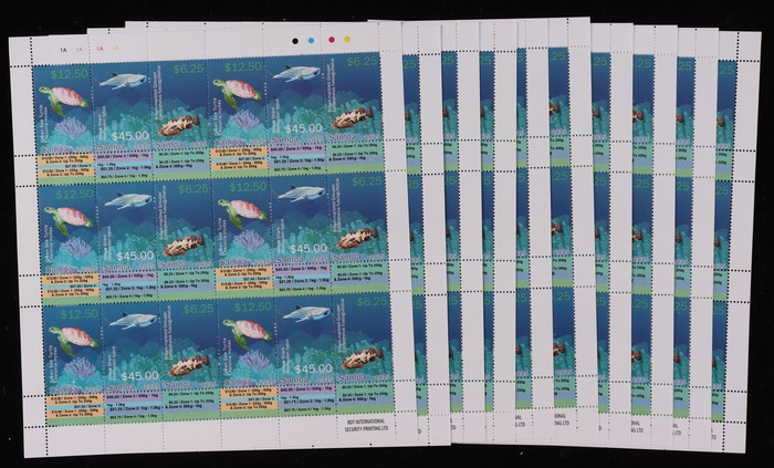 665 imageSamoa: 2015 Marine Life $6.25, $12.50 & $45 set of 3 in se-tenant sheetlets. 60 sets in sheets of 6 sets. VF fresh MNH. FV STS $3840 = A$2400. SG cat £2700 = A$5400. (10 sheetlets) (Image1)