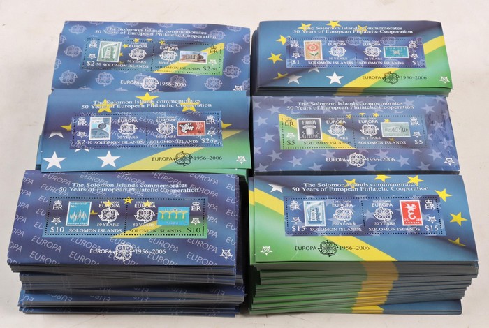 676 imageSolomon Islands: 2006 M/Sheets Europa 50th Anniv set of 12 to $15 in 6 M/Sheets, stock of 200 sets. VF fresh MNH. FV S$14,200 = A$2600. SG MS1137 cat £23 x 200 = £4,600 = A$9,200. (1200 M/S) (Image1)
