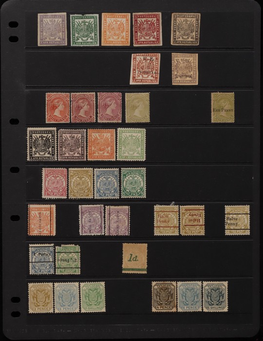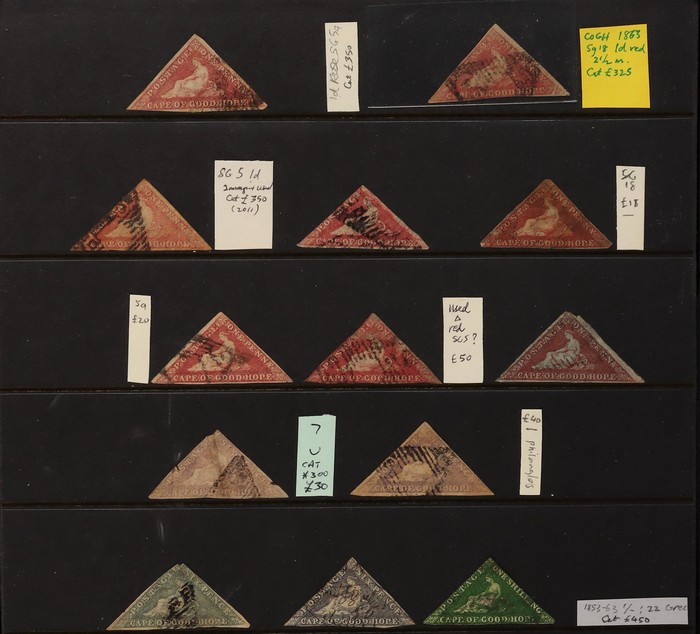 677 imageSouth Africa - Cape of Good Hope: 1853-1904 collection inc 1853-61 Triangle range inc 1d (2), 4d (3), 6d (2) & 1/-. 1864-77 Hope Seated 1d to 1/-, wmk Crown CC, plus shades. 1868 Surch 4d on 6d. 1871-76 Hope Seated ½d to 5/-, wmk crown CC, no outer frame line. 1874-76 Surch 1d on 6d & 1d on 1/-. 1881 Hope Seated 3d rose, wmk Crown CC. 1880 Surch 3 on 3d, both types. 1882-83 Hope Seated ½d to 5/-, wmk Crown CA. 1884-90 Hope Seated to 5/-, wmk Anchor. 1893-1902 Hope Standing ½d, 1d & 3d. 1893-98 Hope Seated ½d to 5/-. 1902-04 KEVII set to 5/-. Mostly G-VFU, some mixed. SG cat £2400+ = A$4800+. (78) (Image1) (Image2) (Image3)