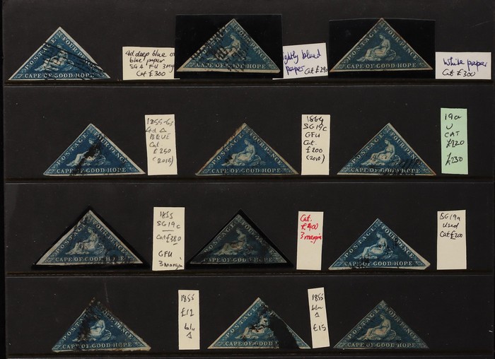 678 imageSouth Africa - Cape of Good Hope: 1853-1900 collection inc 1853 Triangle 1d & 4d, on blued paper. 1855-63 Triangle selection inc 1d (7), 4d (19) inc 2 prs, 6d (4) & 1/- with shades & printings. Selection of 1864-98 Hope seated, vals to 6d. Mostly G-VF U, mixed Triangles as usual. SG cat £6200+ = A$12,500+. (49). (P) (Image1) (Image2) (Image3) (Image4) (Image5)