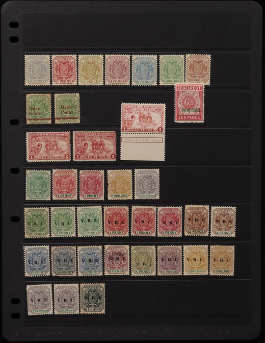 679 imageSouth Africa - Transvaal: 1870-1909 Mint collection inc 1870-77 large Arms 1d (2 shades), 1d black, 3d & 1/-. 1877-79 VT Transvaal opt Arms 1d & 3d. 1878-80 QV vals to 4d. 1882 EEN PENNY opt QV 4d. 1885 Arms set to 1/-. 1885-93 Arms vals to £5 M (but no cert). Range of 1885-93 Surch issues 1895-96 Arms set to 10/-. 1900 VRI opt Arms vals to 5/-. 1902-03 KEVII vals to 5/- & 1904-09 vals to 10/- plus 1902 New Colours set. 1907 Postage Dues set to 1/-. Mostly G-VF M/UN. SG cat £1800 plus the £5 = £5300+ = A$10,000+. (122) (P) (Image1) (Image2) (Image3) (Image4)