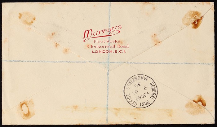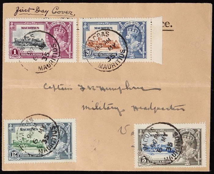 KGV Silver Jubilee set 5c-1R tied by 'General Post Office Mauritius 9 JY 35' cds. To London, reverse stains. SG 245-48 cat £50 as loose stamps & 'from x3' on cover.