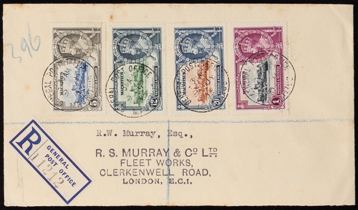 KGV Silver Jubilee set 5c-1R tied by 'Vacaos 6 MY 35' cds. Sent locally. SG 245-48 cat £50 as loose stamps & 'from x3' on cover, plus premium for FDC. (Image1) (Image2)