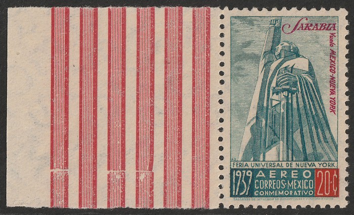 opt airmail 20c opt MUESTRA (as a UPU specimen). VF fresh M. SG 581a(s) cat £3500, Sc C74 cat US$3250, both as normal. Only 480 printed. Key Mexico stamp. 2014 Ceremuga photo cert. (P) (Image1)