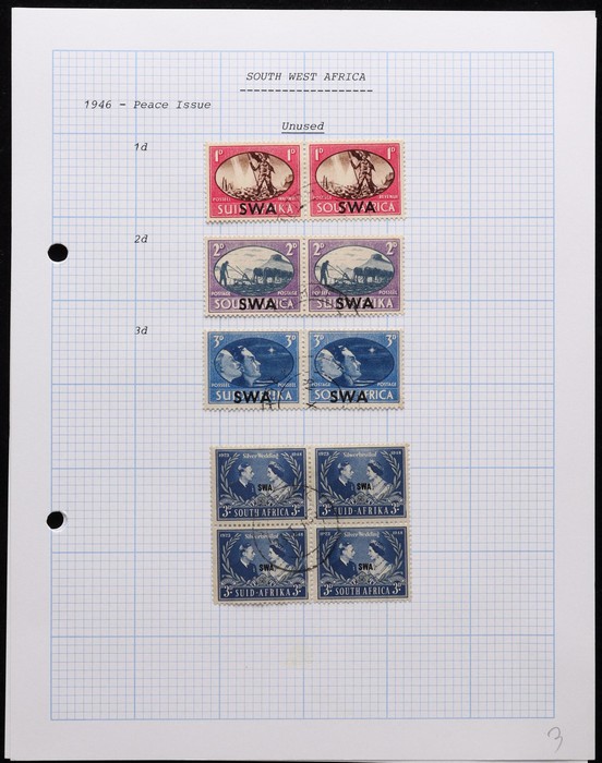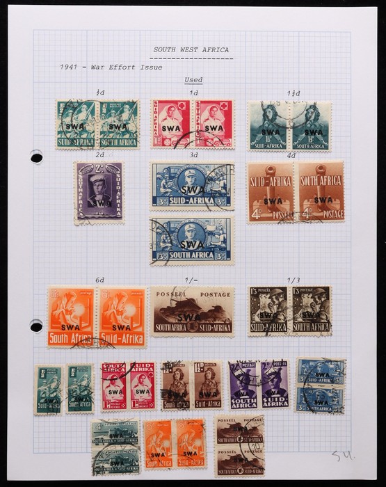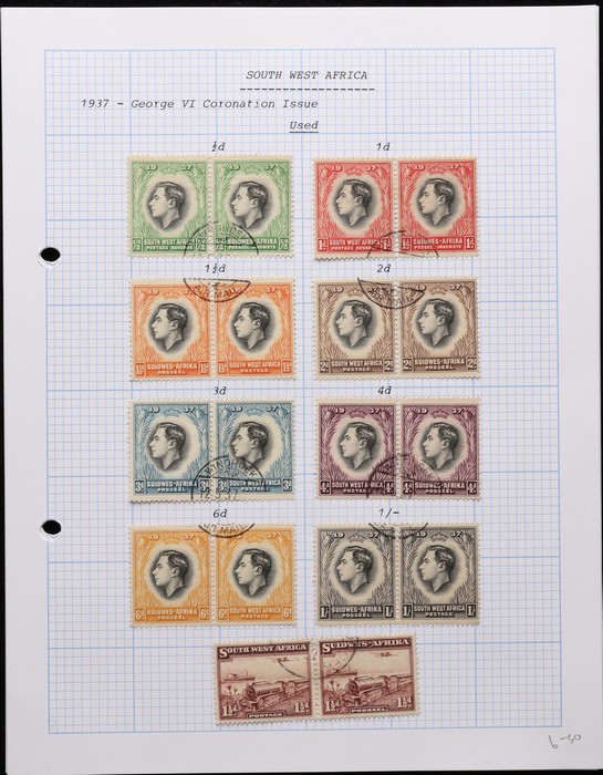 681 imageSouth-West Africa: 1937-52 KGVI used collection on pgs inc 1937 Train 1½d long pr, 1937 Coronation set long prs. 1941-43 War Effort to 1/-. 1943-44 Bantam to 1/-, 1945 Victory set horiz prs, 1948 Silver Wedding blk of 4, 1947 Royal Visit set long prs, 1949 UPU set long prs & 1949 Voortrekker set. All diff. VFU. SG cat £120. (75) (Image1) (Image2) (Image3) (Image4)