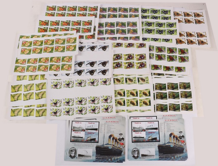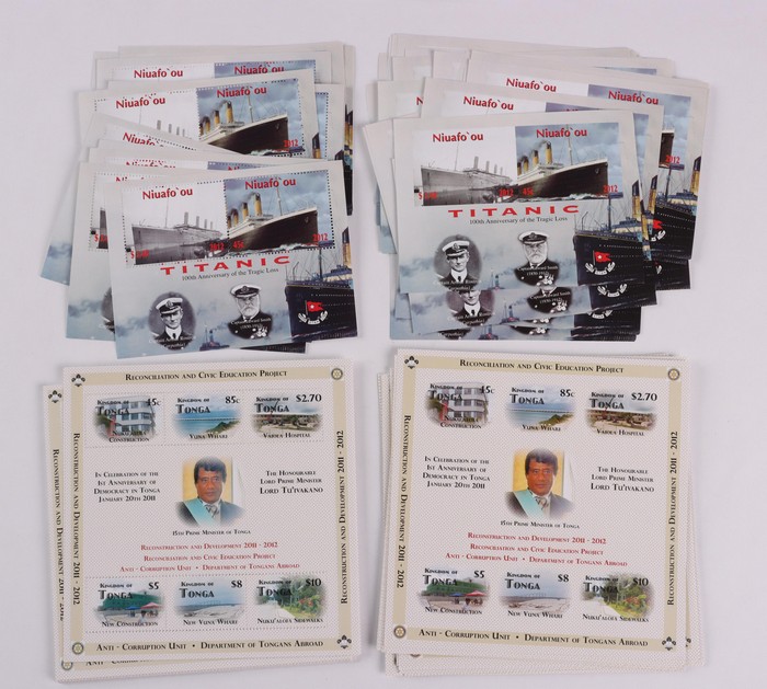 700 imageTonga 2012 Niuafo'ou Butterflies set of 12 to $8, (50 imperf sets in sheets of 20 & panes of 10) FV T$2300 = A$1500, SG cat £2100. 2012 Niuafo'ou Titanic 100th Anniv $1360 M/Sheet (25 of each) both imperf & perf & $3.85 M/Sheet (50 of ea, imperf & perf). FV T$1060 = A$700 SG cat £1100, 2012 Democracy $27 M/S imperf (50) & normal (50), FV T$2700 = A$1800, SG cat £2800. All fresh MNH, total SG cat £5900 = A$11,800, FV A$4000! (Image1) (Image2) (Image3)