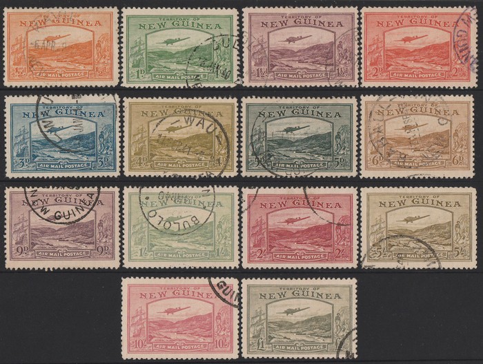 Salamaua, Taslasea, Wau, Wewak. Few Birds imprint prs (1½d, 2d & 2½d). Range of Huts, inc 6d brown ochre & yellow brown (SG 130 & 130b). G-VFU. SG cat £690+, should be at premium of at least 50% for pmks £1000. Interesting