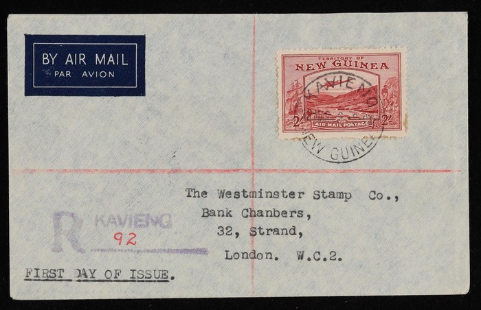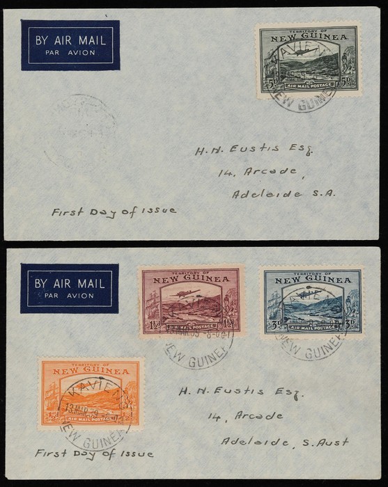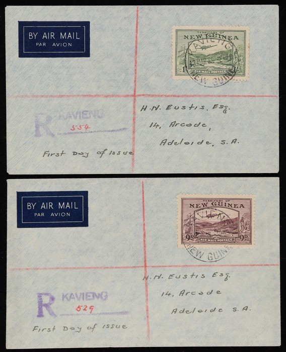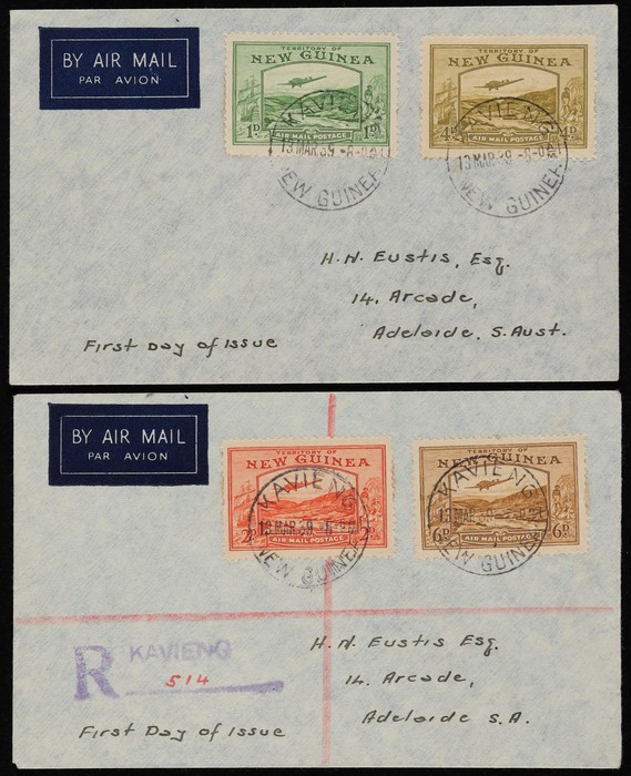 ½d to 2/- on 7 FDC (4 reg), tied by 'Kavieng 13 MAR 39' which is believed FDI at that PO. SG 212-22 cat £250++ as loose stamps alone & 'from x2' on cover, so £500, plus premium for FDC. (7 covers) (P) (Image1) (Image2)