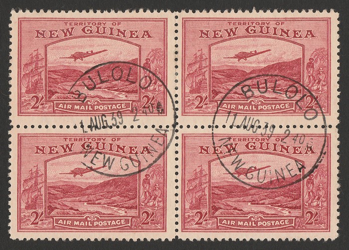 2/- dull lake, blk of 4. VFU, 'Bulolo 1 AUG 39' cds. SG 222 cat £300+ as singles, plus premium for blk. (P) (Image1)