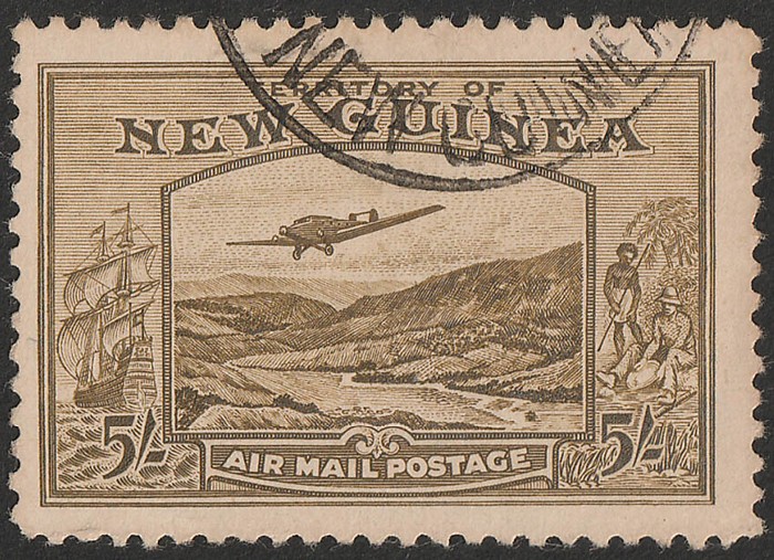 Madang (23 Aug) to Wisconsin, USA 'via Rabaul-Sydney-Singapore Hong Kong & China Clipper' but carried via Salamaua (26 Aug) to Townsville (27 Aug, route had changed in July), and Hong Kong (3 Sep) franked 1932-34 Undated Birds 5/- solo franking. This