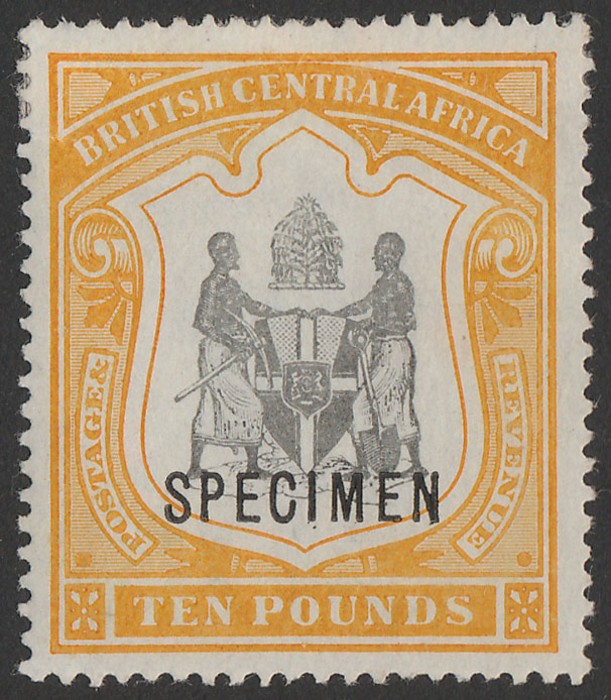 £10 black & yellow, opt SPECIMEN. VF fresh MLH. Scott 56(S) cat US$300, SG 52s cat £350 (normal cat £12,000). (P) (Image1)