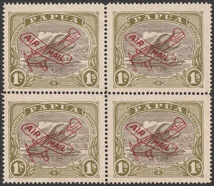 opt 1/- sepia & olive, opt in deep carmine-lake (instead of normal carmine), Harrison printing on yellowish paper, blk of 4 with 1st stamp major variety 'AI,R' due to comma between I & R. VF 2MLH/2MNH. SG 117(var). Only small 1st part of printing was