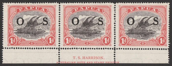 Lakatoi 1d black & red Harrison imprint strip of 3. VF fresh MNH. SG O56(var) cat £30 as M singles, should be at least double, £60 MNH, plus premium for imprint.