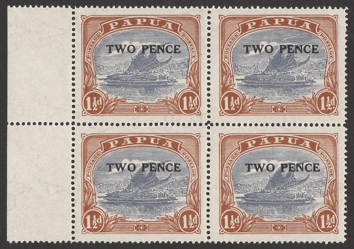 Lakatoi 1½d bright blue & bright brown Ash printing, with POSTACE variety UL stamp & retouched rift in sky at pos 1&2 in blk of 4, with 2 normals. VF fresh MNH. SG 122/122a cat £45 for M so £90 MNH, plus premium for variety blk. (Image1)